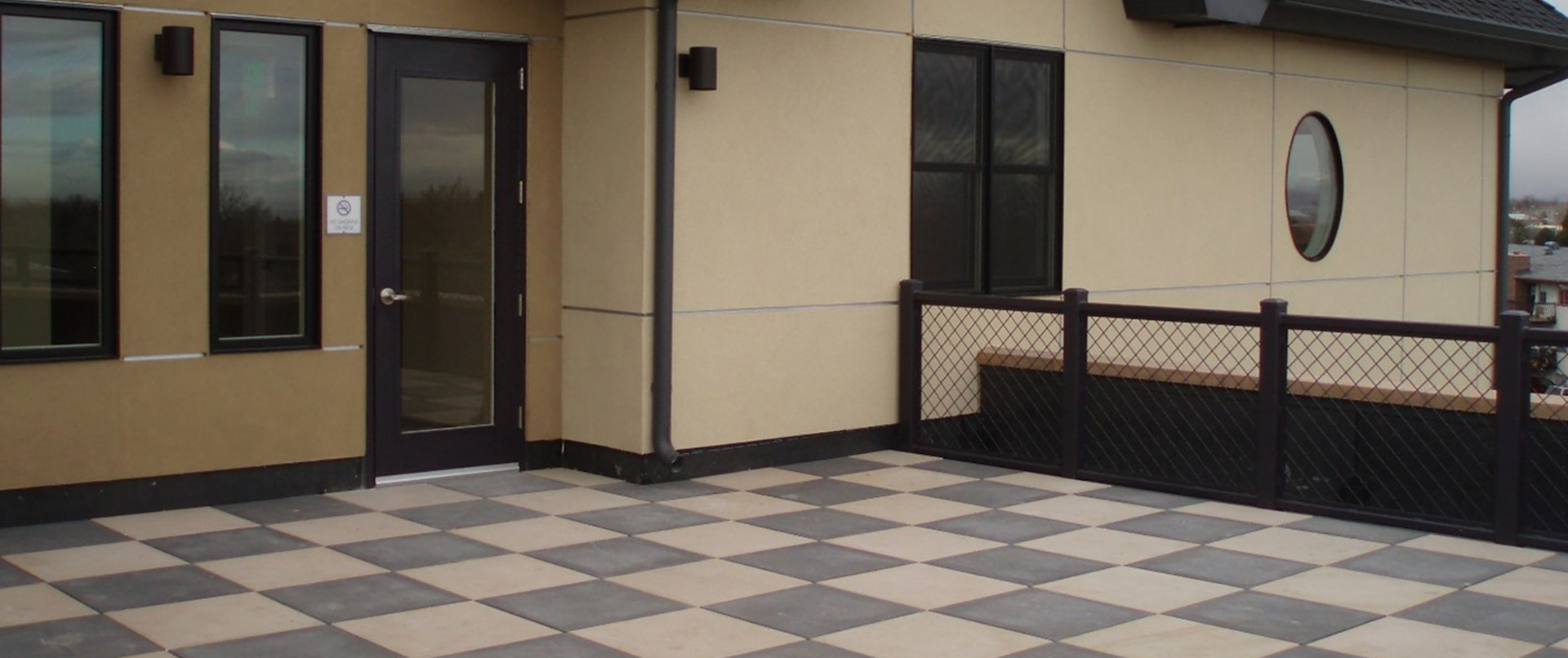 El salón de usos múltiples ampliado utiliza pedestales ajustables ScrewJack y baldosas de concreto que fueron donados por Bison para crear un balcón en la azotea perfectamente nivelado. El balcón al aire libre, con sus vistas panorámicas del horizonte de Denver, cuenta con una chimenea y cómodos asientos, lo que proporciona un área acogedora para que las familias se relajen y disfruten del espíritu de unión.