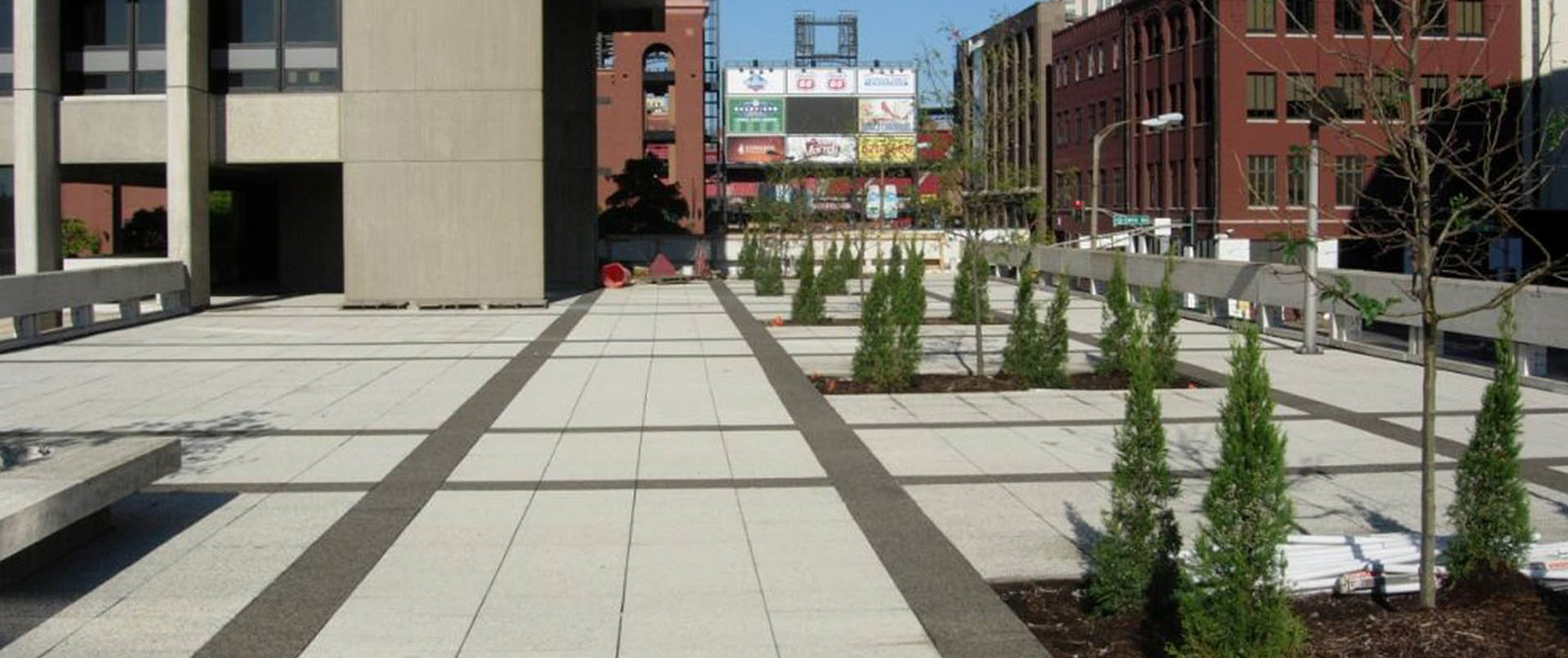 La plaza se construyó con baldosas modulares de concreto sostenidos por pedestales ajustables Bison ScrewJack.