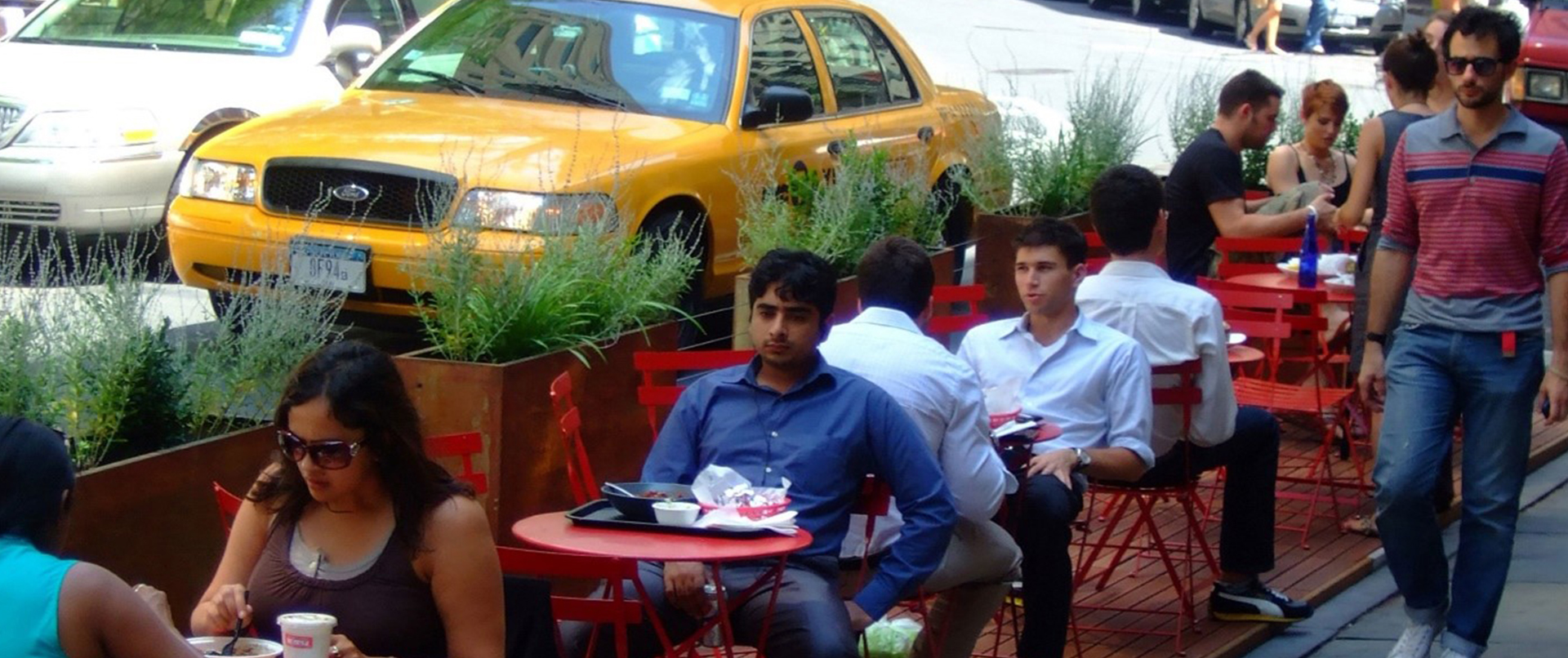 En un intento por crear más espacio abierto en Pearl and Broad en el distrito financiero de Nueva York, las empresas de la comunidad unieron fuerzas para crear un miniparque temporal e innovador. Este parque temporal se extiende desde la acera donde alguna vez hubo cuatro espacios de estacionamiento. Está abierto al público en general, pero fue financiado por los establecimientos adyacentes para crear un atractivo exterior y proporcionar asientos a lo largo de las aceras llenas de transeúntes.