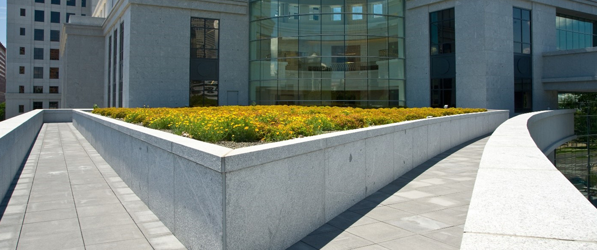 Construido para durar más de 100 años, el Centro Judicial es uno de los pocos juzgados del país en lograr la Certificación LEED Gold. Las características sostenibles incluyen un techo verde para filtrar el agua de lluvia, un sistema de iluminación de recolección de luz solar fotosensible y paisajismo tolerante a la sequía. El corredor que rodea el techo verde se creó con baldosas de concreto de 2x2 y pedestales Bison ScrewJack. Los pedestales, fabricados con un 20 % de materiales reciclados posindustriales, también ayudaron a reducir la huella de carbono de este edificio gubernamental consciente del medio ambiente. ¡Las baldosas de concreto complementan la arquitectura neoclásica y serán un escaparate para el sistema de justicia estadounidense en la ciudad capital de Colorado durante muchos años más!