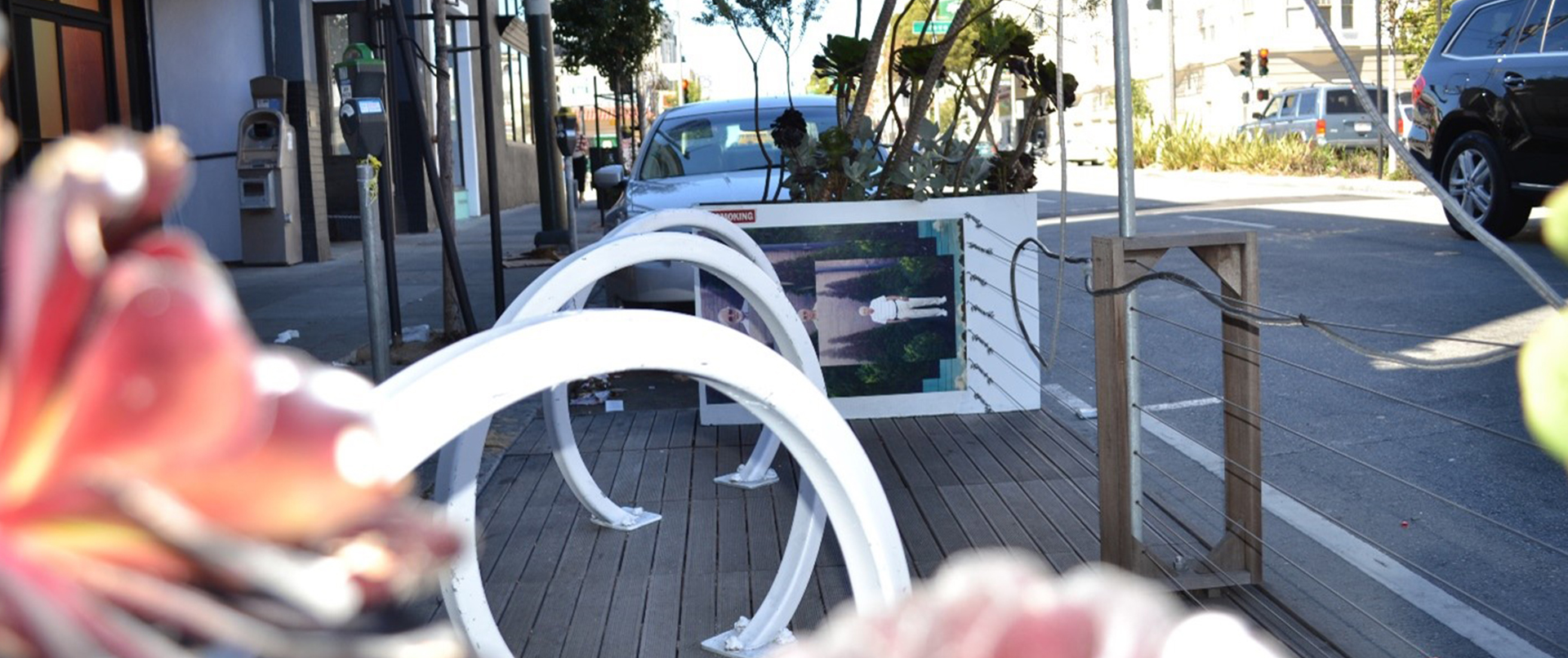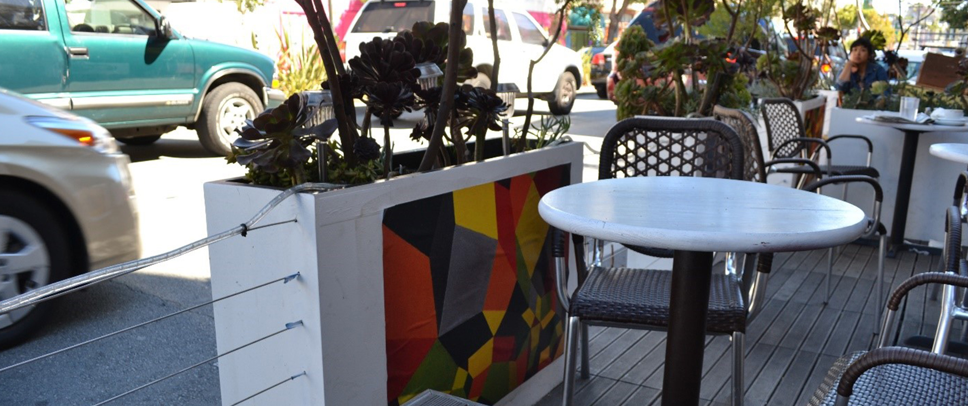 El parklet, que ocupa un espacio utilizado formalmente como dos lugares de estacionamiento paralelos para vehículos, ofrece varios cientos de pies cuadrados de bancos, mesas, maceteros y portabicicletas para los miembros de la comunidad y los clientes de la cafetería. Este programa piloto en San Francisco fue un gran éxito y aumentó las ventas en la cafetería hasta en un 20 %.