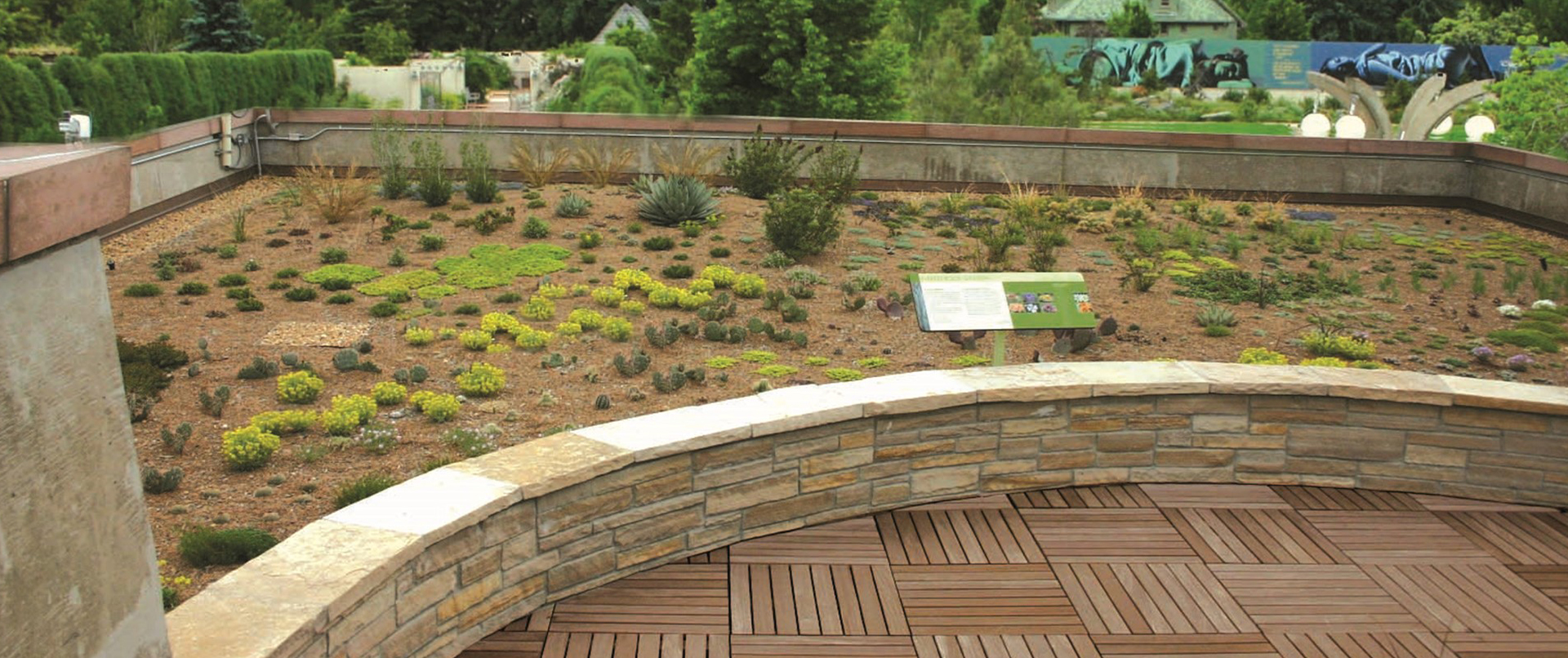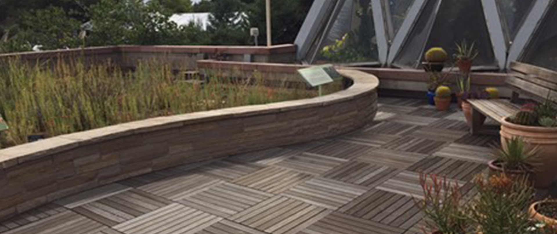 En los Jardines Botánicos de Denver se instaló un sistema de plataforma Bison en la terraza para crear acceso a su exhibición de techo verde. El techo verde fue el primer jardín de acceso público de su tipo en Denver que utilizó baldosas de madera Ipe de Bison y pedestales ajustables Level.It. ¡El techo verde presenta más de 100 especies de plantas nativas y tolerantes a la sequía! La instalación única requirió intrincados cortes de baldosas de madera alrededor del perímetro curvo del techo verde. Para ver videos de la instalación, haga clic