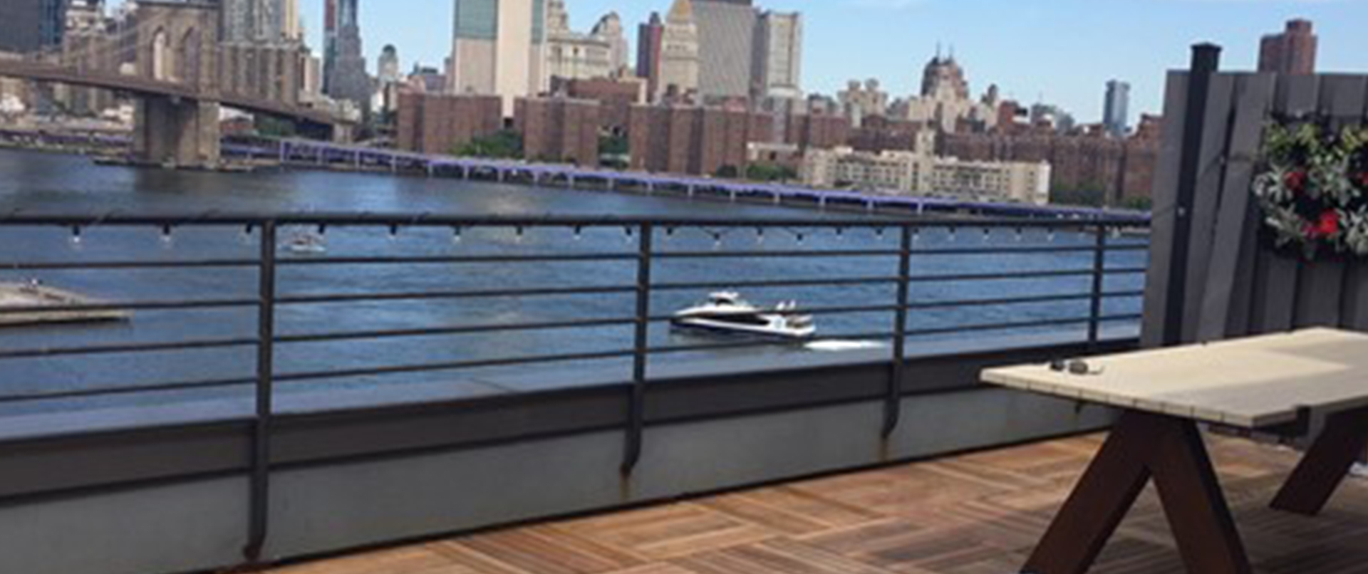 La fachada de ladrillo meticulosamente conservada se combina con un lujoso diseño interior. La plataforma lounge en la terraza de 2500 pies cuadrados que disipa el estrés ofrece una de las vistas más impresionantes de todo Nueva York: el puente de Brooklyn, el puente de Manhattan y el horizonte del bajo Manhattan. La plataforma de la terraza sobre Gair2 se construyó con baldosas de madera de Ipe liso de 9 tablones Bison 2x2 colocadas en un patrón de parquet, con el apoyo de pedestales ajustables Versadjust de Bison.