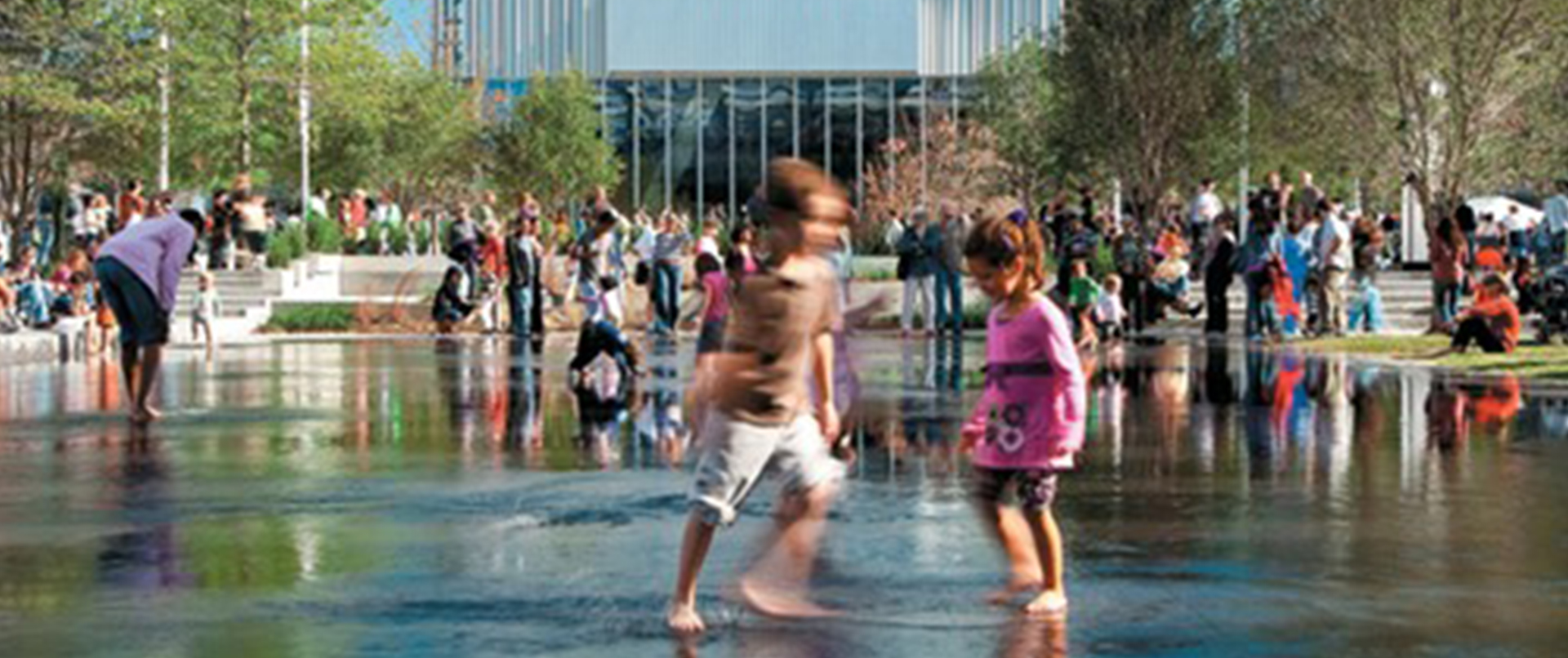 En el corazón del complejo se encuentra el patio del Centro que cuenta con una piscina reflectante poco profunda donde las familias pueden reunirse para divertirse. La piscina exhibe baldosas de piedra adornados con los nombres de los donantes que hicieron posible el Centro y cuentan con el apoyo de los pedestales Bison Versadjust.