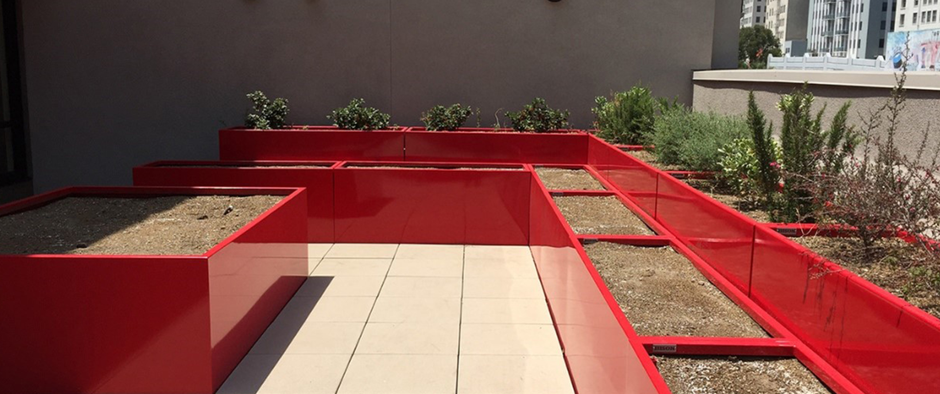El complejo cuenta con una espectacular plataforma en la terraza con una gran variedad de cubos de Bison de aluminio con recubrimiento en polvo, de tamaño personalizado para que los residentes interesados lo utilicen como jardines comunitarios. Los cubos de Bison, cuentan con orificios de drenaje y mangas de riego, facilitan el cuidado de la vegetación y son muy populares entre los inquilinos. Los maceteros y las baldosas de concreto en esta terraza inferior están sostenidos por pedestales Bison Versadjust.