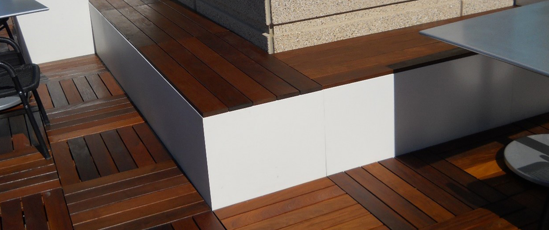 Esta plataforma en la terraza de una oficina corporativa en Sunnyvale, California, instaló baldosas de madera de Ipe liso de 6 tablones de Bison de 2x2 teñidas y selladas, colocadas en un patrón de parquet, y cubos de aluminio con recubrimiento de polvo blanco Bison de 2x2 y 2x4 de varias alturas, todos los cuales están sostenidos por pedestales ajustables Bison Versadjust.